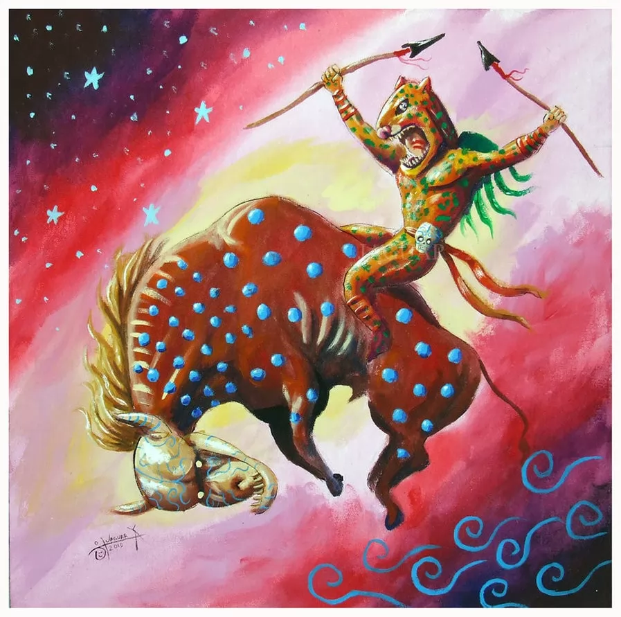 La bestia son los instintos, pasiones y pensamientos desenfrenados siendo domados por el Jinete Jaguar quien representa las virtudes y la voluntad, su doble lanza es por que se trata de un princimpio 100% activo. la calavera en su cinto es por que ha conq